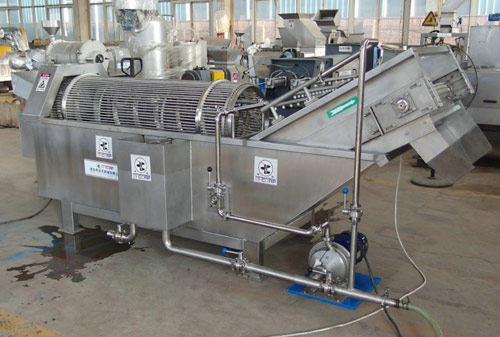 該清洗機(jī)采用逆流洗滌原理壓噴淋管,使物料在整個(gè)翻轉(zhuǎn)移動(dòng)的過程中又受到高壓水的噴淋沖洗,清洗效果好,可有效除泥、除沙。清洗后的物料由清洗槽內(nèi)的提升機(jī)提升到下道工序。,物料從進(jìn)口流入清洗機(jī)滾筒內(nèi),隨著滾筒內(nèi)壁的螺旋轉(zhuǎn)動(dòng)至出口,而清洗槽內(nèi)的水,在滾筒內(nèi)螺旋的反作用下流向清洗機(jī)進(jìn)口,與物料逆向運(yùn)動(dòng),同時(shí)在滾筒內(nèi)安裝有高