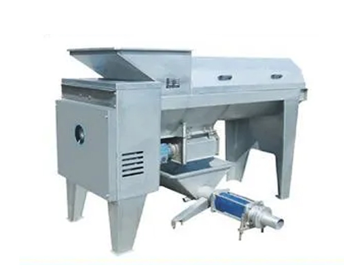 石榴從進(jìn)料斗進(jìn)入上破碎裝置,上破碎裝置將石榴壓開(kāi),兩輥間隙為20毫米,然后進(jìn)入下破碎裝置,下破碎裝置再次將石榴擠壓,兩輥間隙為10毫米,經(jīng)過(guò)兩級(jí)擠壓的石榴已基本皮籽分離,并落入分離裝置,在攪拌軸的攪拌下,石榴籽從篩孔落下,石榴皮從尾部排出,上下破碎輥為彈性結(jié)構(gòu),間隙可調(diào)。石榴籽及汁用螺桿泵送至壓榨機(jī)。