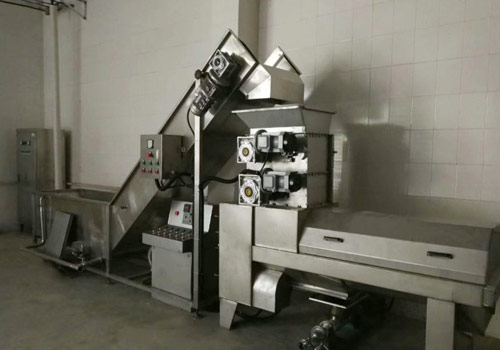 將經(jīng)過(guò)挑選、清洗的新鮮石榴切口、擠開(kāi)、分離出石榴皮,并將果漿輸送至壓榨機(jī)進(jìn)行下道工序的生產(chǎn)。
