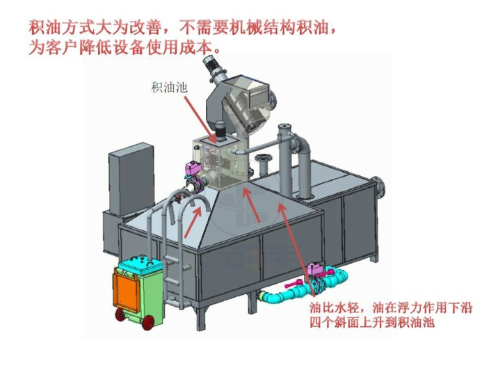 該油水分離裝置主要利用油與水的比重不同,油比水輕,油在浮力作用下沿著隔油池斜面上升到集油池,油集聚到一定的量而自動排出,分離后的水從另一端(提升站)排出,從而實現(xiàn)餐飲廢水以及其它油污廢水的油水分離,進(jìn)而實現(xiàn)油品綜合利用,外排廢水動植物油的含量達(dá)到環(huán)保標(biāo)準(zhǔn)。